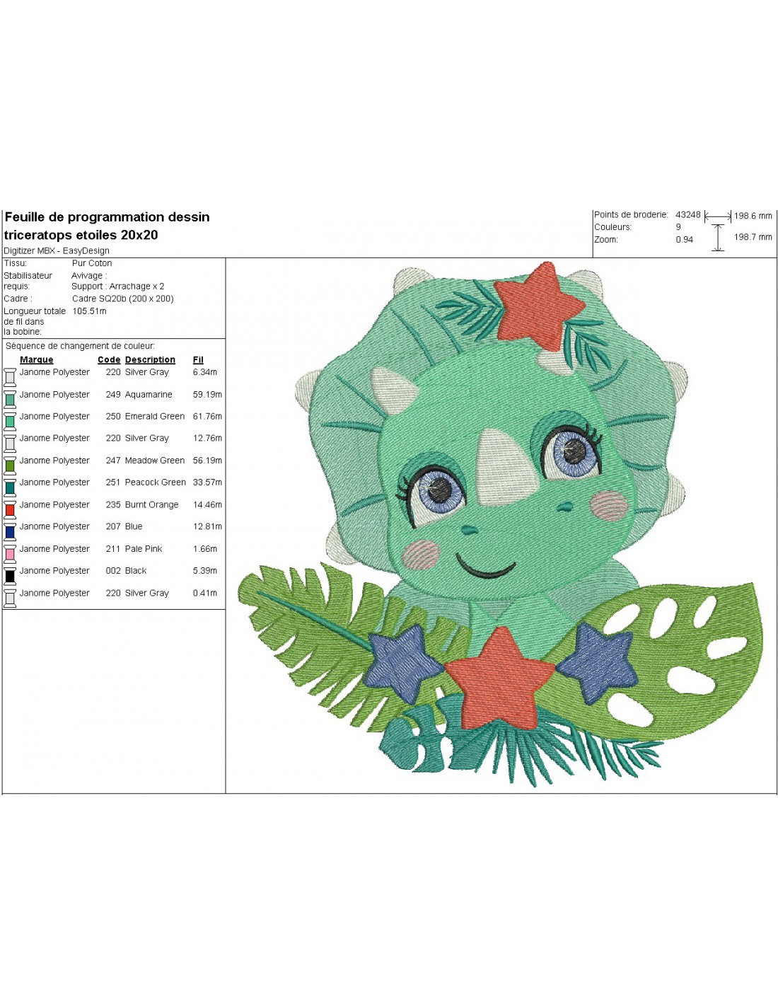 Motif de broderie machine dinosaure triceratops avec ses étoiles