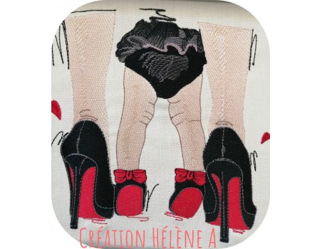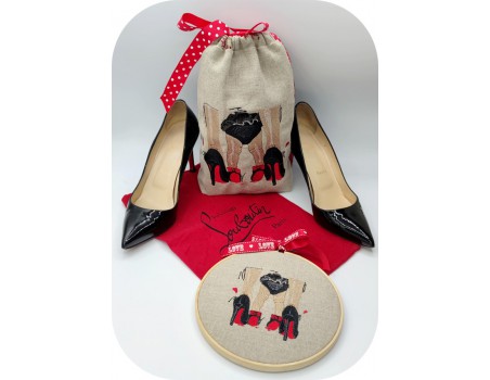 Voici un motif de chaussures noires vernis à semelles rouges, mère et fille à broder sur diverses créations comme un pochon pour ranger vos chaussures