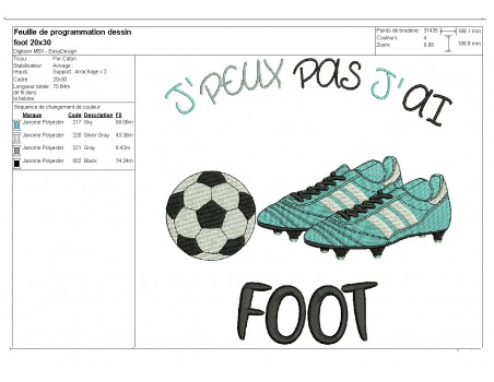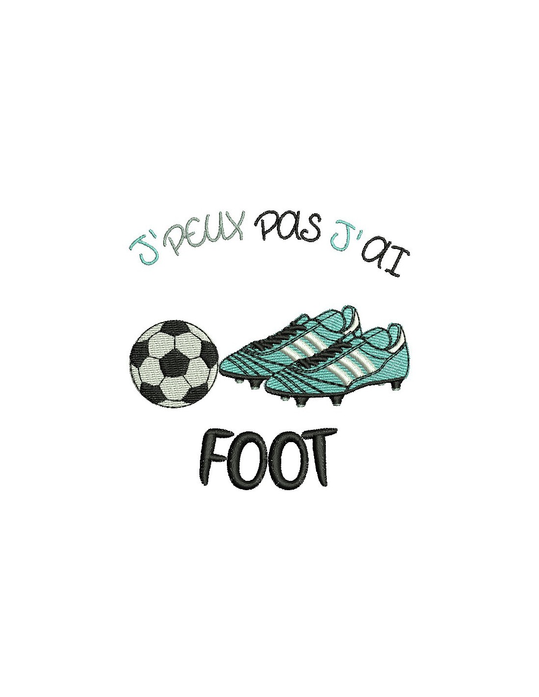 Voici un motif pour les fans de foot, j'peux pas j'ai foot avec le ballon et les chaussures de foot à broder sur diverses créations