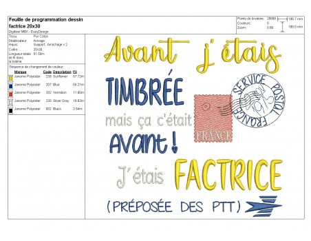 Motif de broderie machine texte factrice