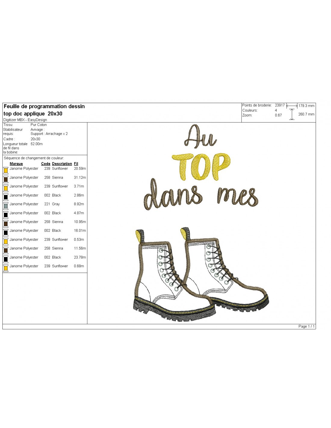 Voici un motif texte avec une paire de chaussures montantes à broder en appliqué sur diverses créations