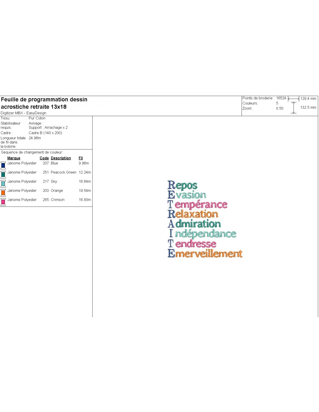 Voici un acrostiche pour la retraite à broder sur diverses créations