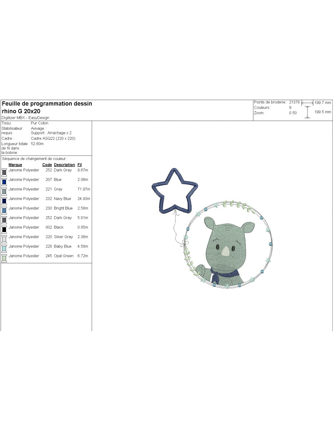 Voici un petit rhinocéros version garçon à broder sur différentes créations avec son ballon étoile en appliqué et personnalisable