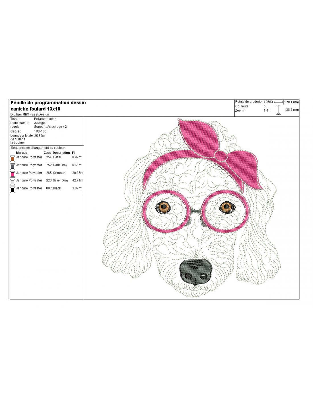 Voici un caniche avec ses lunettes et son foulard à broder sur de multiples créations