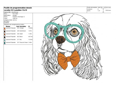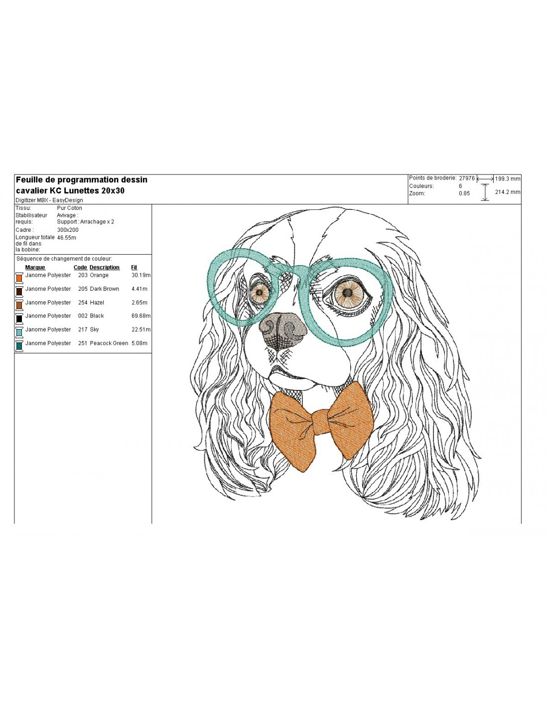 Motif de broderie machine cavalier king charles avec ses lunettes