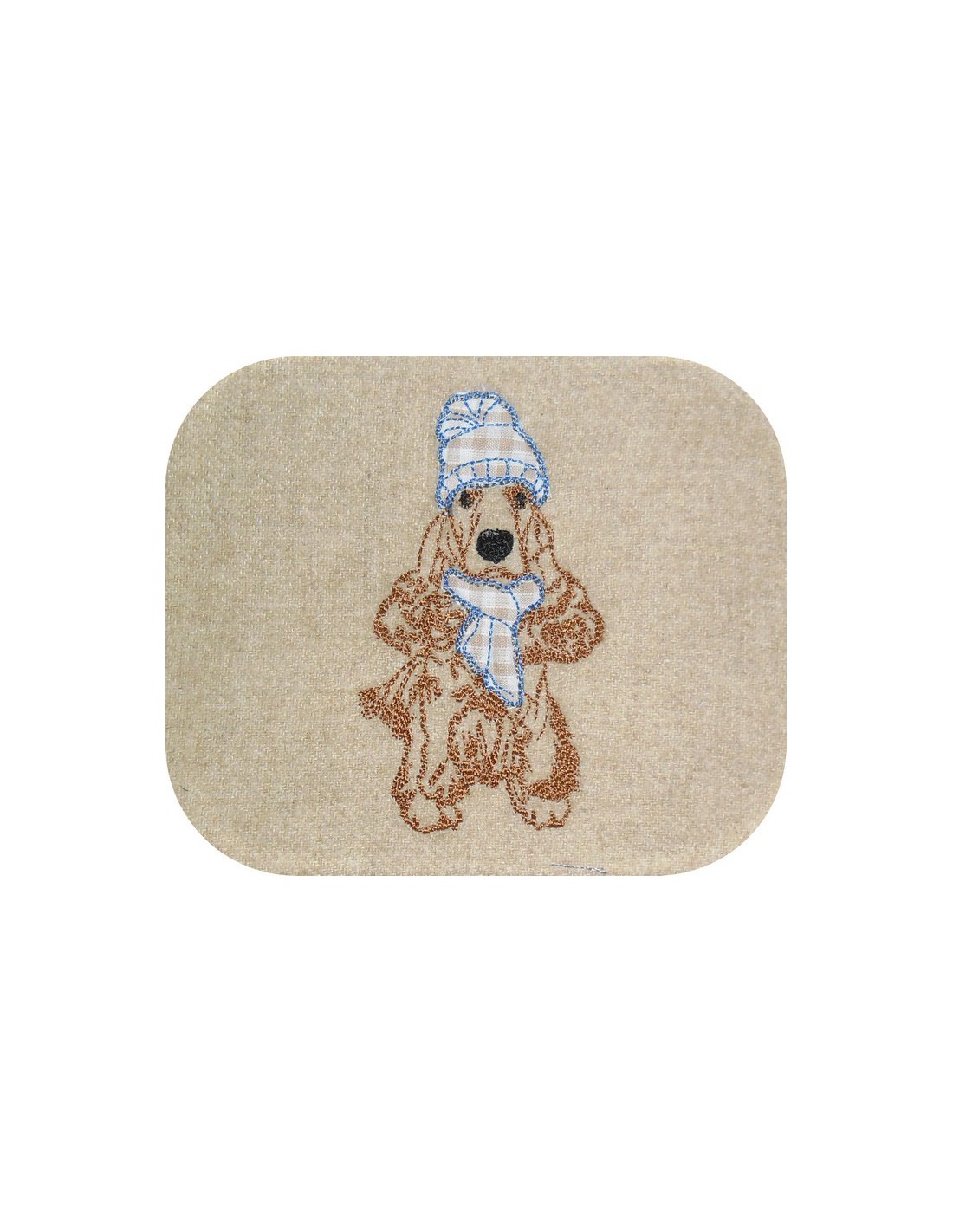 Voici un cocker croquis à broder sur de multiples créations avec son bonnet et son écharpe en appliqué
