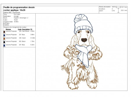Motif de broderie machine cocker avec son bonnet et écharpe en appliqué