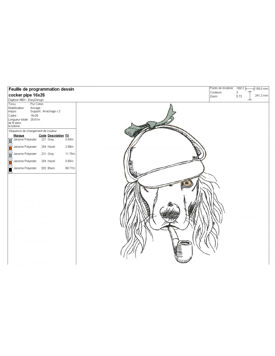 Voici un cocker croquis à broder sur de multiples créations avec sa casquette en appliqué et sa pipe