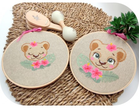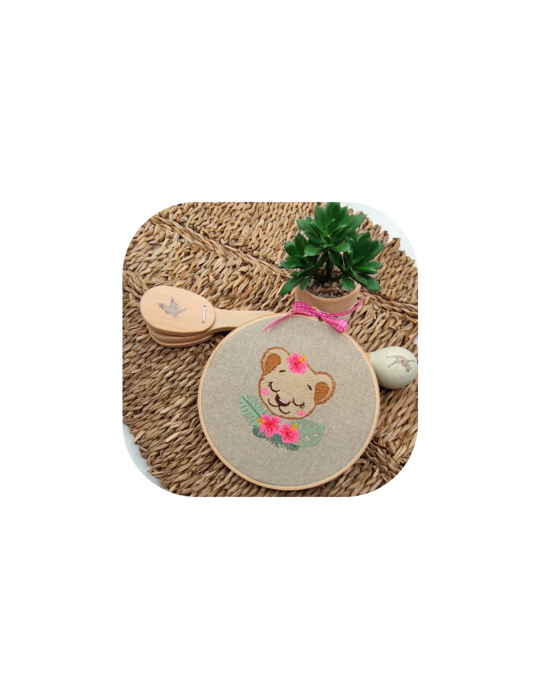 Voici une lionçonne endormie à broder sur différentes créations avec ses fleurs