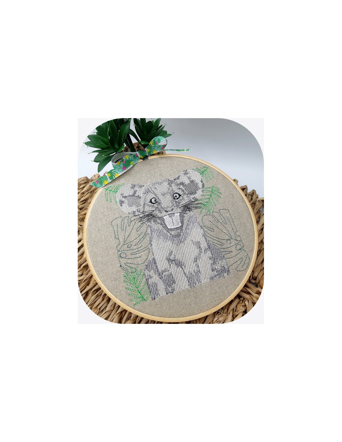 Voici dans le thème savane un petit lion à broder avec ou sans le fond feuillage pour être dans la tendance sur différentes créations