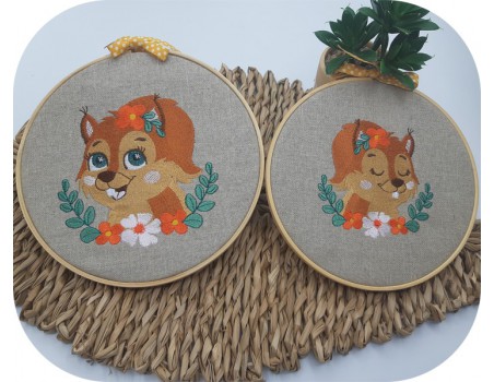 Voici une petite écureuil endormie à broder sur différentes créations avec ses fleurs