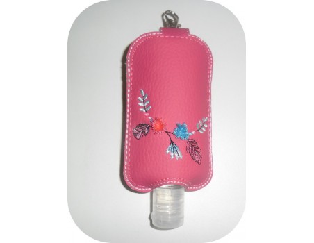 Voici un étui pour flacon type gel hydroalcoolique ou flacon de voyage à broder tout dans le cadre et en 2 tailles brodé de plumes et de pompons en 3D