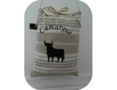 Un motif de broderie sur le thème de la Camargue, le taureau Camarguais en ombre chinoise, pour personnaliser vos créations régionales avec ou sans le texte pour vos personnalisations