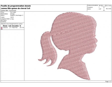 Voici un profil de petite fille avec une queue de cheval à broder sur diverses créations