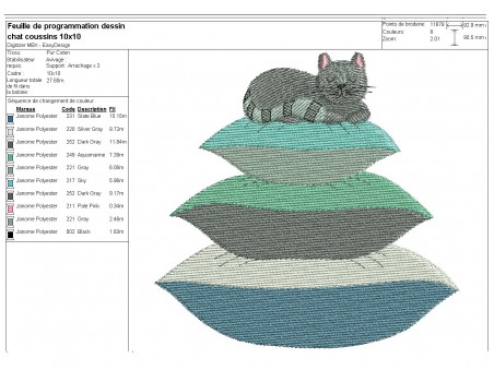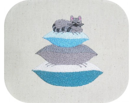 Voici un chat couché sur des coussins à broder sur de multiples créations