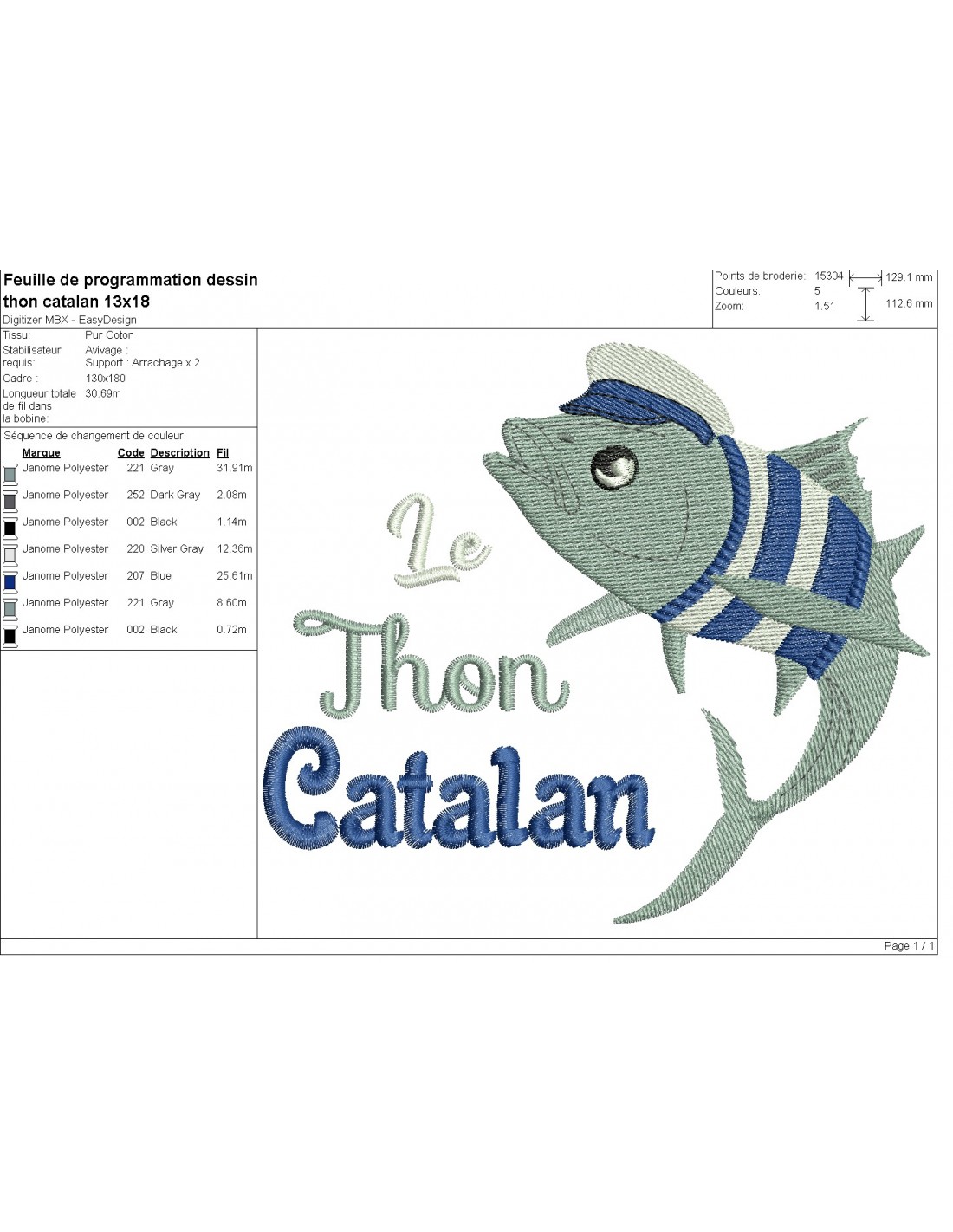 Voici un thon catalan à broder sur diverses créations estivales ou autres créations pour votre cuisine par exemple