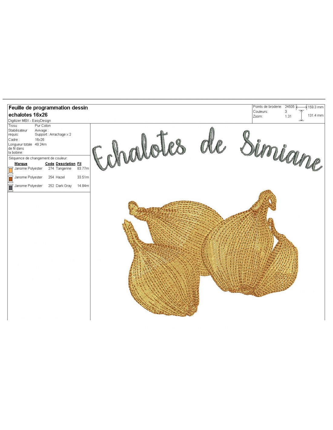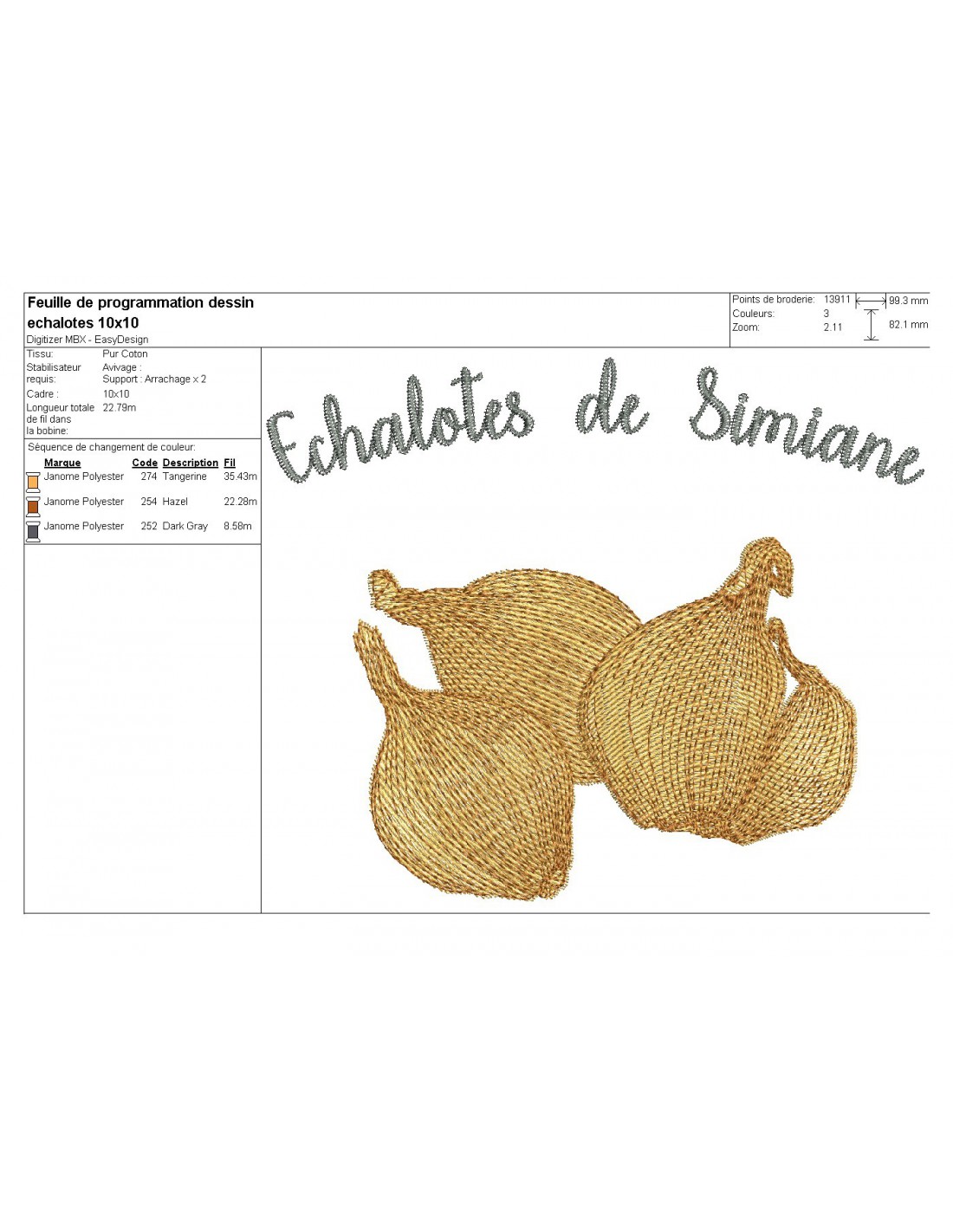Voici un motif les échalotes de Simiane à broder sur diverses créations comme sur un tablier , un torchon, un pochon