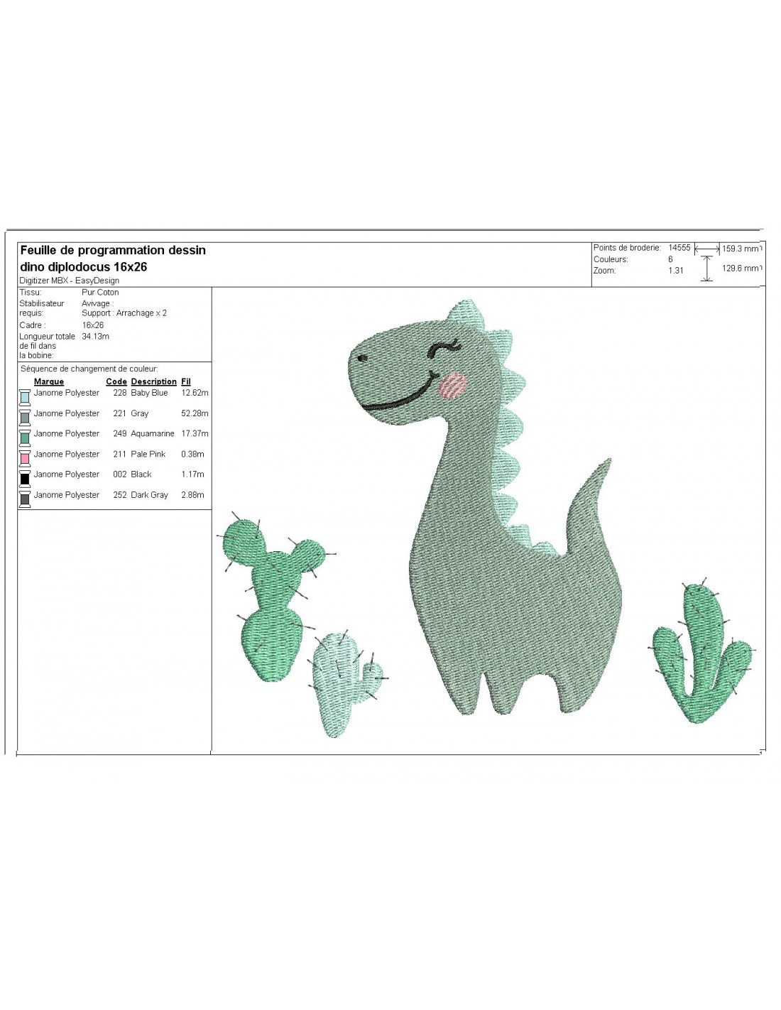 Voici un petit dinosaure diplodocus à broder sur diverses créations pour les enfants