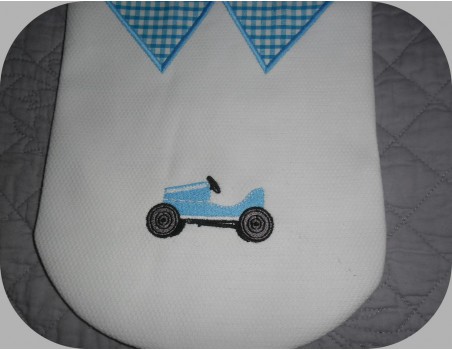 Voici un jouet ancien, une voiture à pédales à broder sur diverses créations