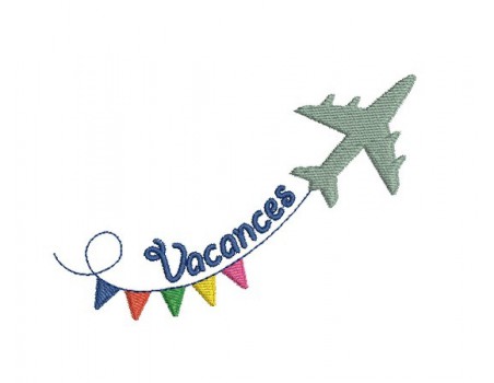 Voici un avion avec sa banderole fanions et son texte vacances ou voyage à broder sur vos diverses créations estivales comme votre serviette de plage, une fouta, une pochette à glisser dans votre sac de plage ....