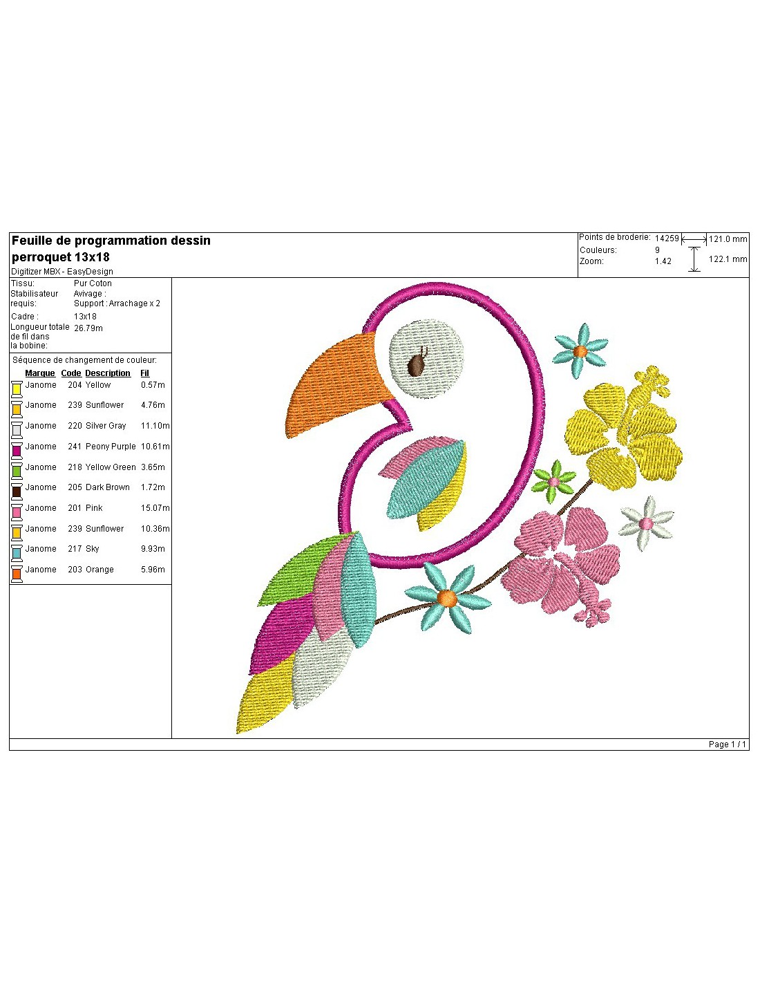 Motif de broderie machine perroquet