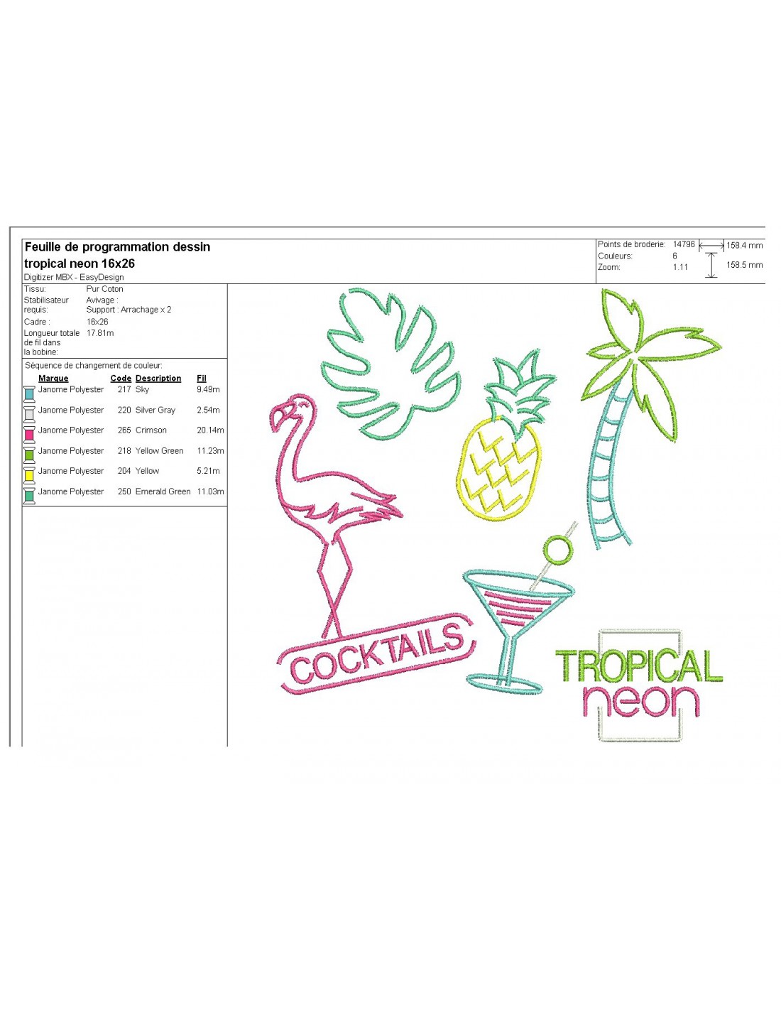 Motif de broderie machine flamant rose tropical néon