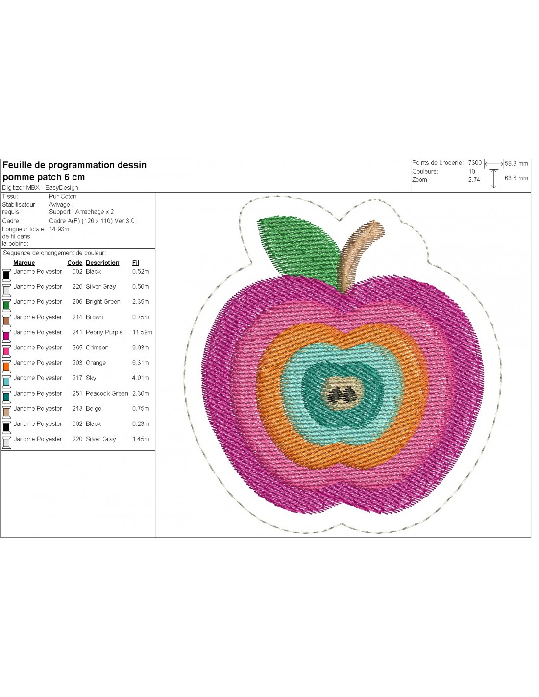 Motif de broderie machine patch pomme multicolore