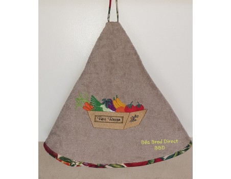 Voici un panier remplit de fruits et légumes à broder sur diverses créations pour votre cuisine