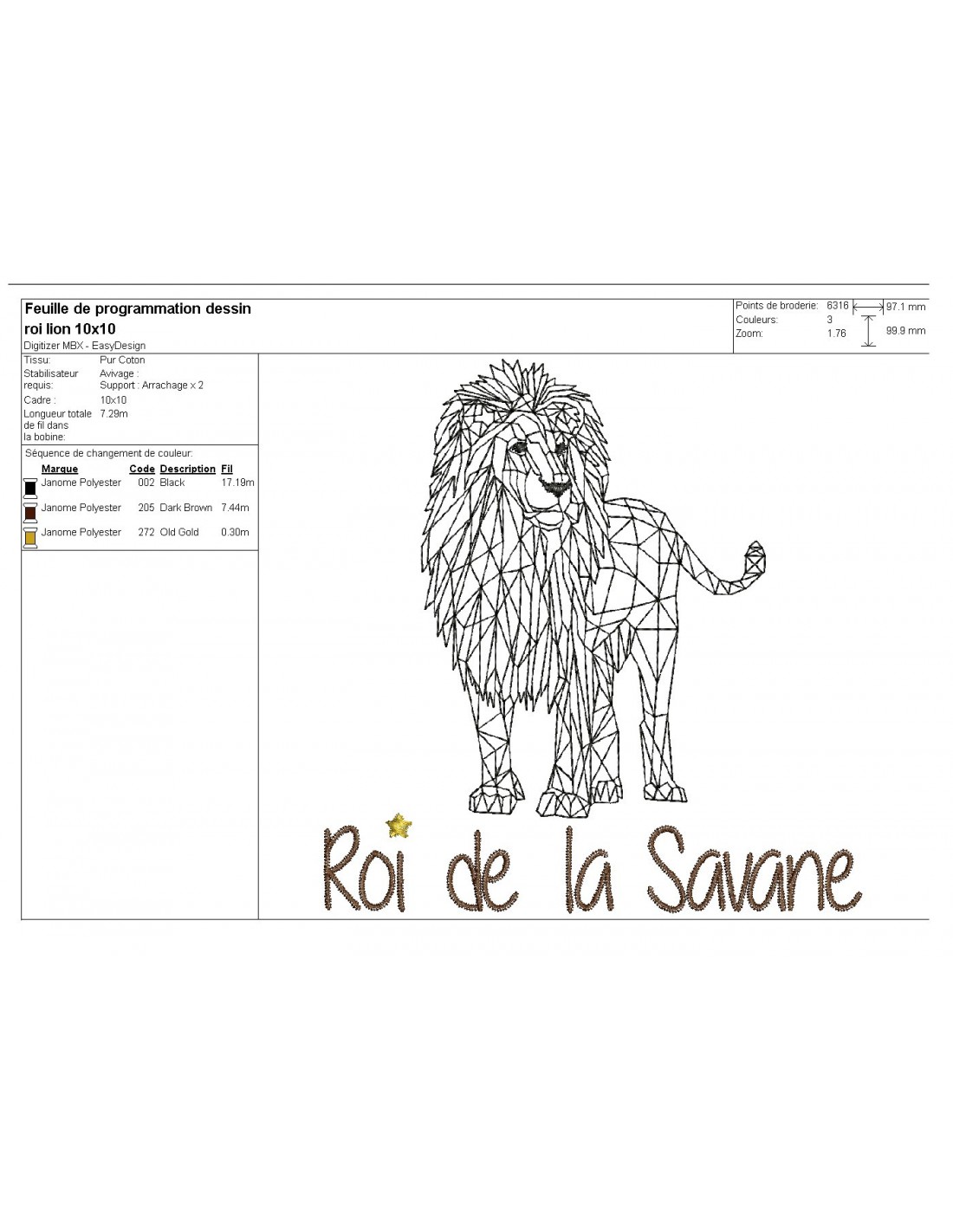 Motif de broderie machine Lion roi de la savane