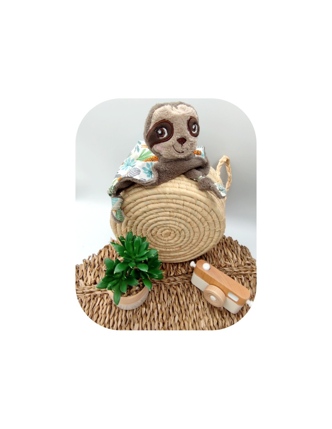 Voici une tête de doudou paresseux a broder tout dans le cadre pour les enfants pour réaliser ensuite à la machine à coudre un doudou