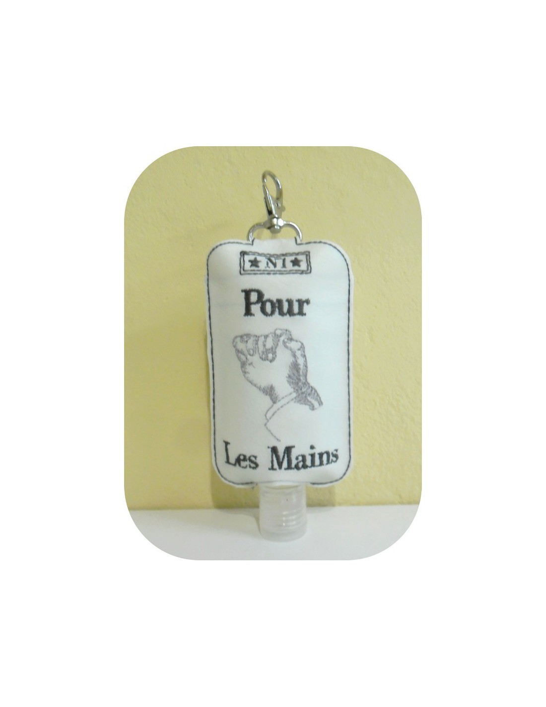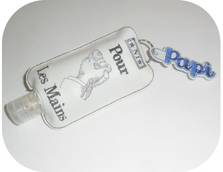 Voici un étui pour flacon type gel hydroalcoolique ou flacon de voyage à broder tout dans le cadre