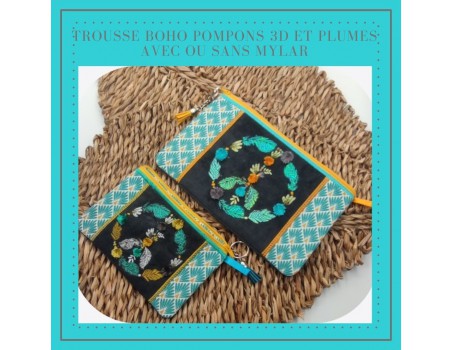 Voici une trousse pompons Boho entièrement doublée à broder tout dans le cadre et en 2 tailles avec la fermeture éclair sur le haut avec ses plumes
