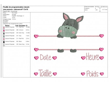 Voici un motif de broderie, un petit âne à broder en personnalisant avec les infos naissance pour une fille sur diverses créations avec des coeurs