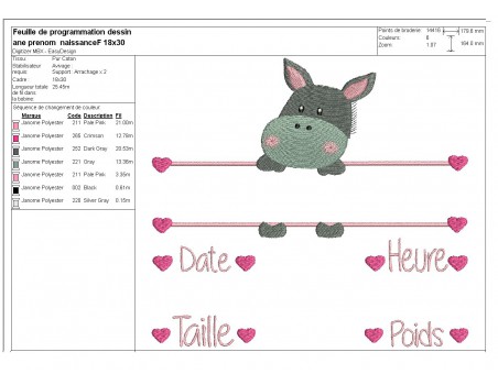 Motif de broderie machine petit âne journal de naissance fille