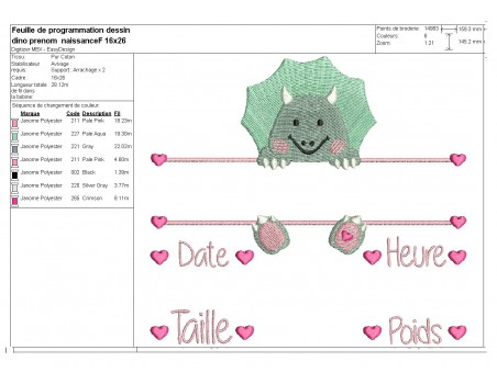 Voici un motif de broderie, le dinosaure à broder en personnalisant avec les infos naissance pour une fille sur diverses créations avec des coeurs