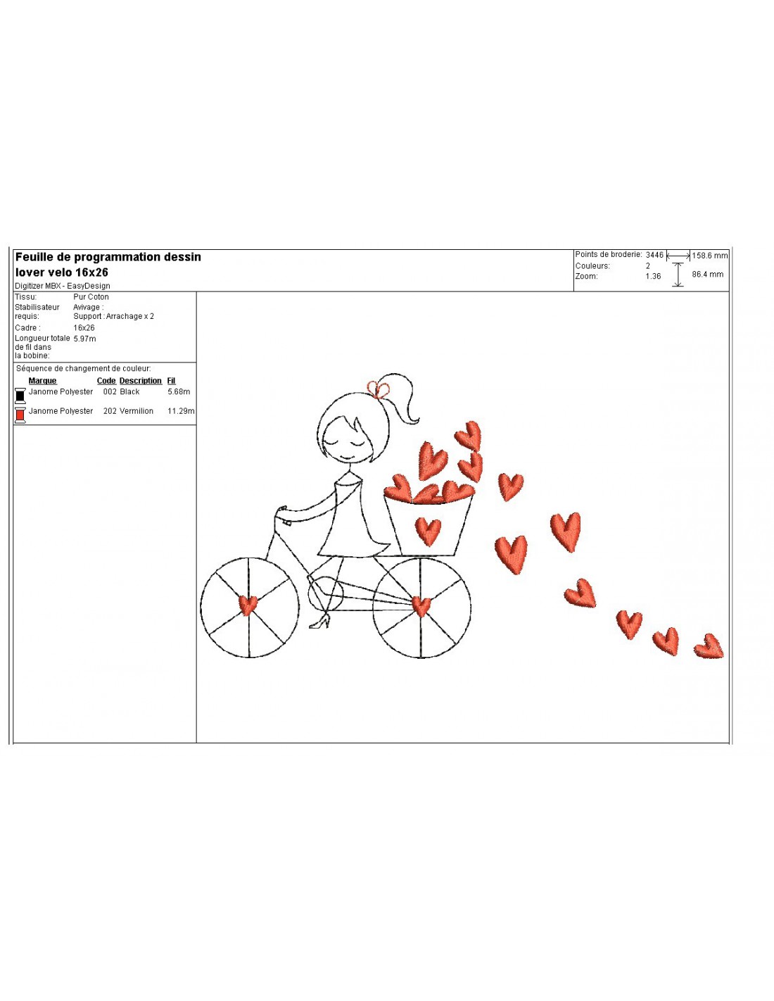 Voici une fille à vélo transportant des coeurs dans son panier à broder sur vos diverses créations pour la saint Valentin ou autre