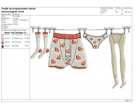 Voici sur une corde à linge de sous vêtements homme et femme avec des petits coeurs à broder sur un pochon ou un petit sac pour y ranger les épingles à linge