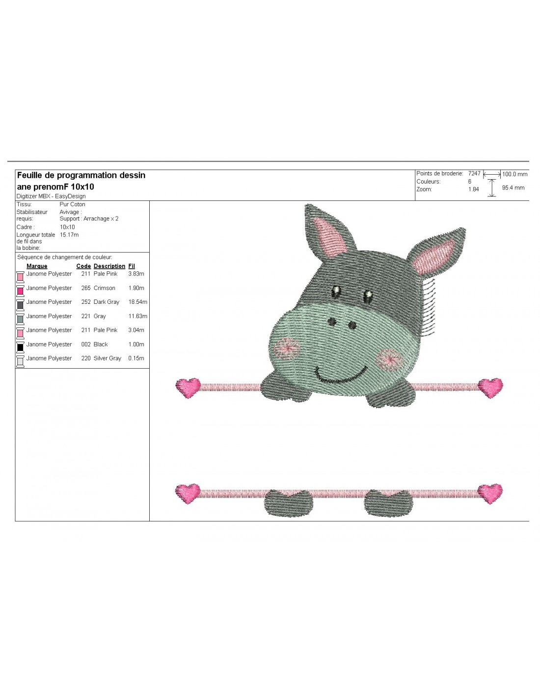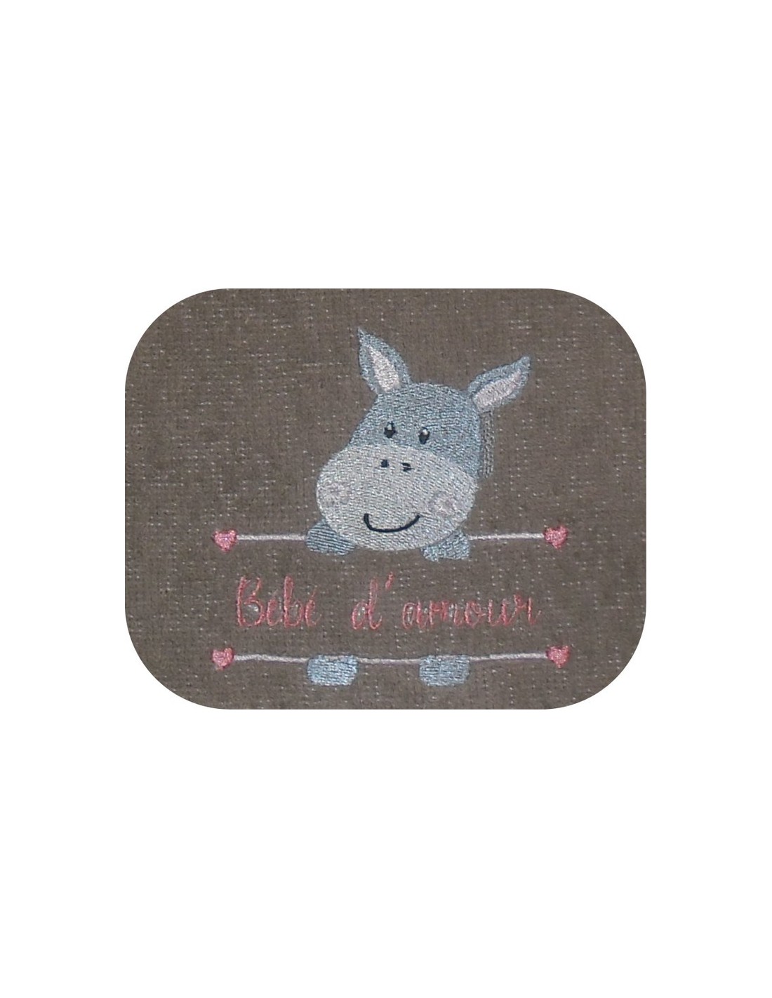 Voici un motif de broderie, un petit âne à broder en personnalisant avec un prénom pour une fille sur diverses créations avec des coeurs