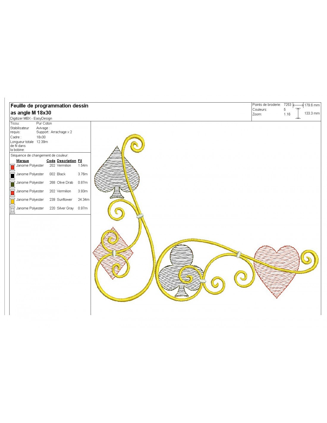 Motif de broderie machine as angle jeu de cartes couleurs en mylar