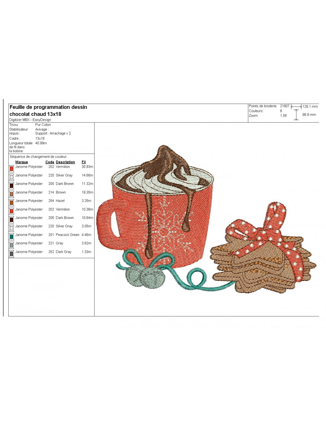 Motif de broderie machine chocolat chaud avec des gâteaux sablés