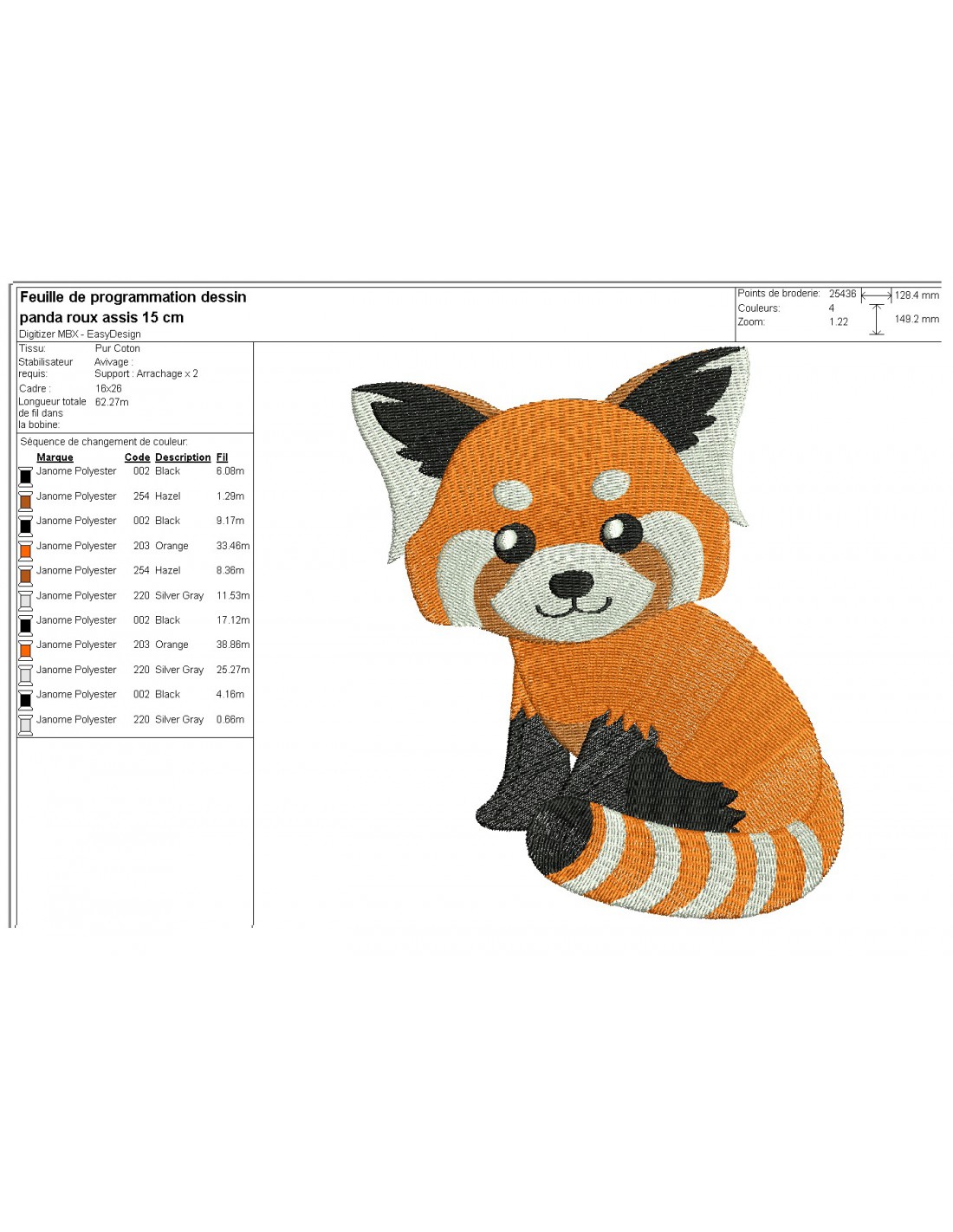 Voici un motif de broderie, un panda roux assis sur diverses créations