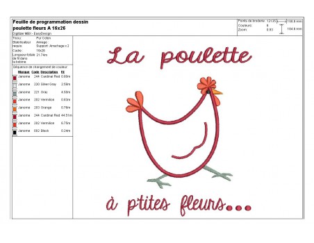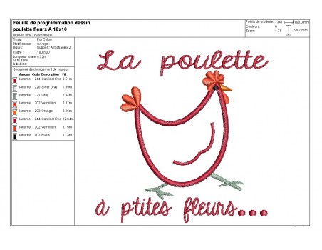 Motif de broderie machine poule à fleurs appliquée