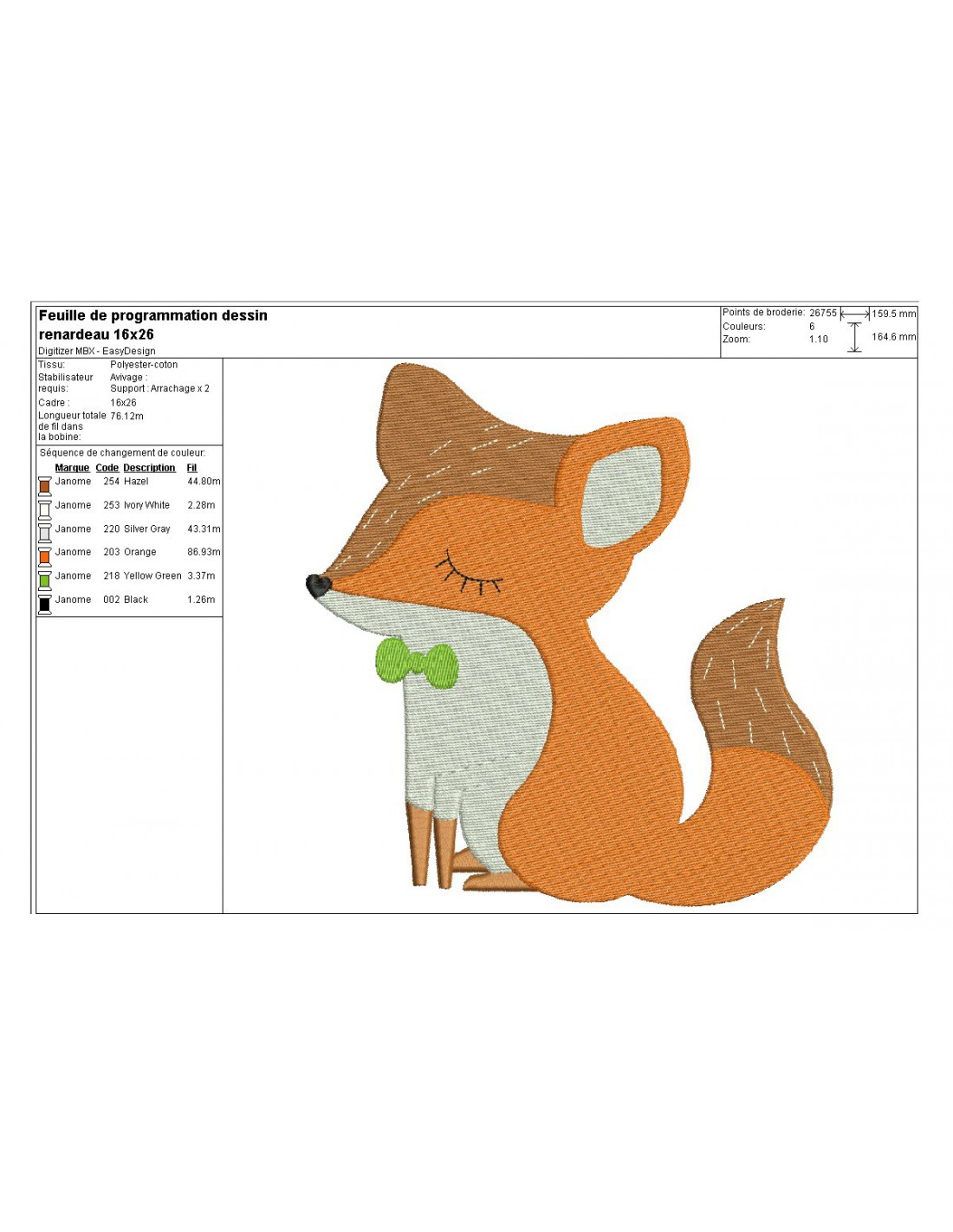 Voici un petit renard à broder avec son noeud de papillon sur diverses créations pour les enfants