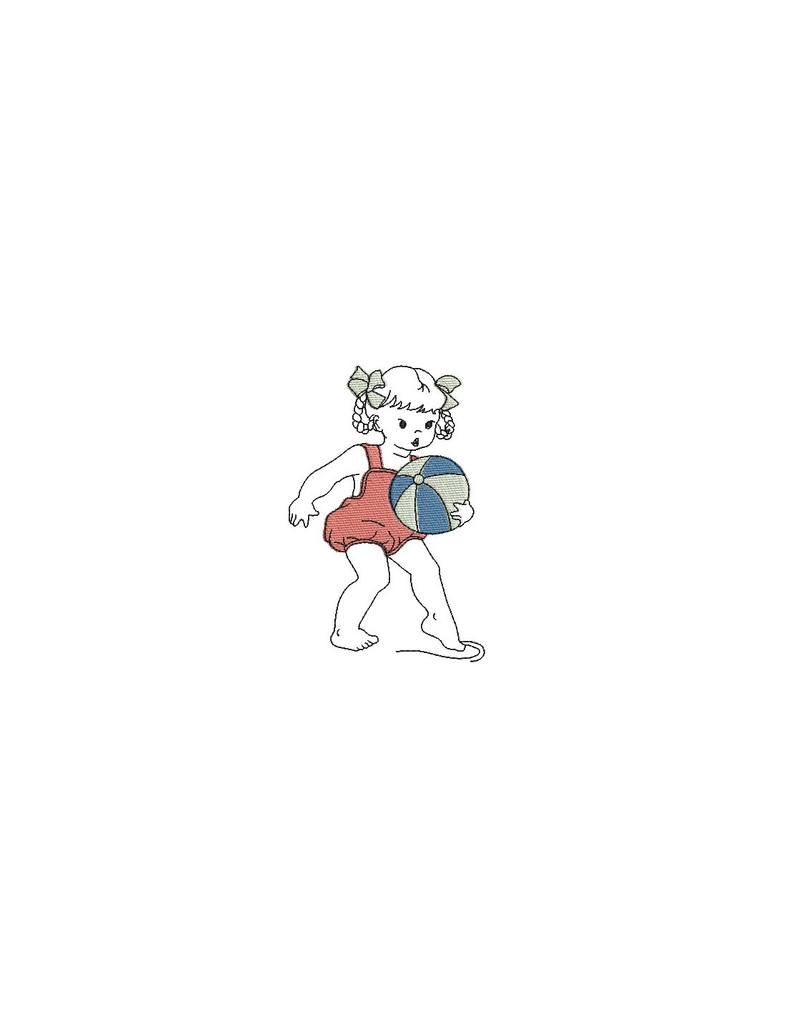 Voici une petite fille jouant à la plage jouant au ballon à broder dans un esprit rétro sur de bien diverses créations