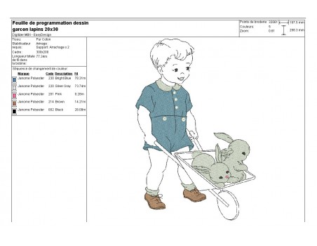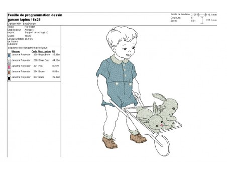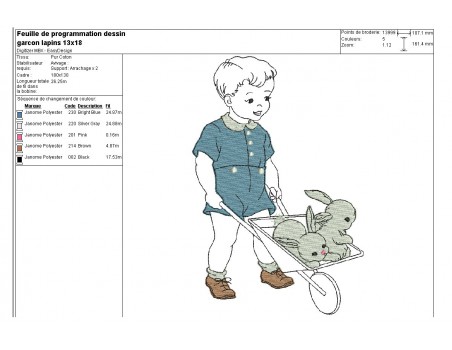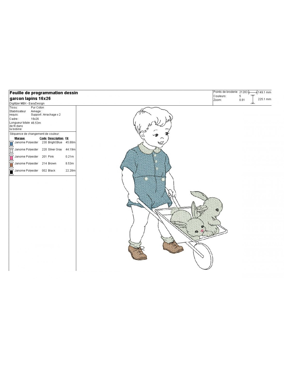 Voici un petit garçon promenant dans une brouette ses lapins à broder dans un esprit rétro sur vos diverses créations